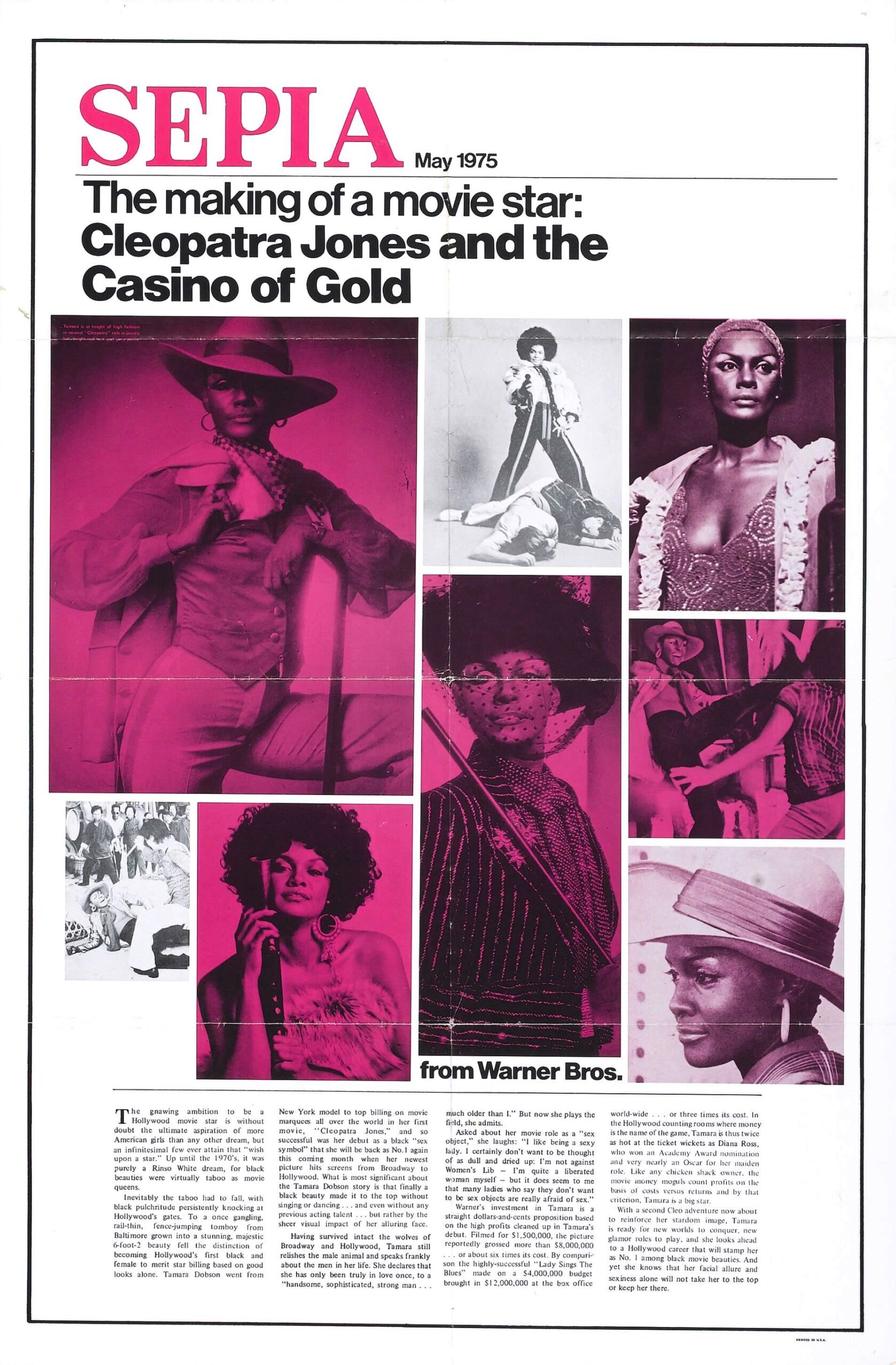 Øverst på plakaten findes navnet på magasinet “**Sepia**” trykt i **store, fed tekst** i en rød nuance, som skiller sig ud mod den hvide baggrund. Under dette står der en beskrivende tekst, der kommunikerer temaet “The making of a movie star: Cleopatra Jones and the Casino of Gold”.