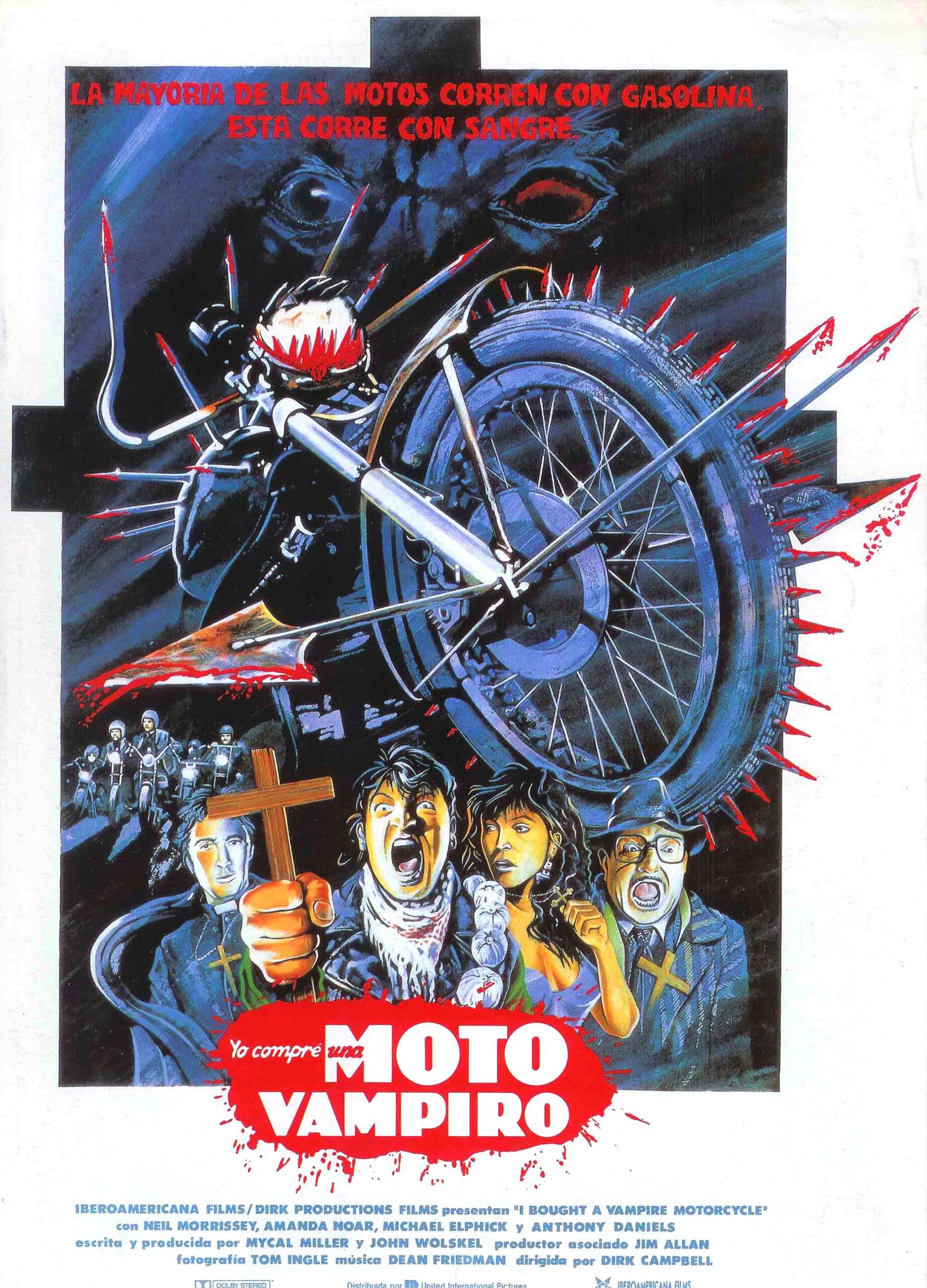 Plakaten fremviser et livligt og farverigt design, der er typisk for genren den repræsenterer. Centralt på plakaten ses en del af en motorcykel med et blodtørstigt udseende, omgivet af spidser og blodsprøjt, hvilket antyder en overnaturlig eller uhyggelig tematik. Baggrunden er dominert af en mørk tone, hvilket tilføjer en omsvøbende følelse af fare. I underkanten af plakaten står flere figurer, der virker skræmte eller bekymrede, hvilket øger spændingen og indikerer en truende fare.
