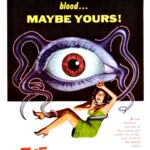 Plakaten viser et nærbillede af en dukke med et skræmmende udtryk. Dukken har **blå øjne** med en intens rød farvetone i midten, og der er en **bloddråbe** der løber ned fra den ene side af munden.