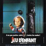 Plakaten domineres af den ikoniske figur **Chucky**, som er en dukke med et skræmmende udtryk. I hans hænder holder han en stor saks, klar til at klippe hovederne af en legetøjsklovn. Dette billede bygger på filmens tematisk element af skrekk og spænding.