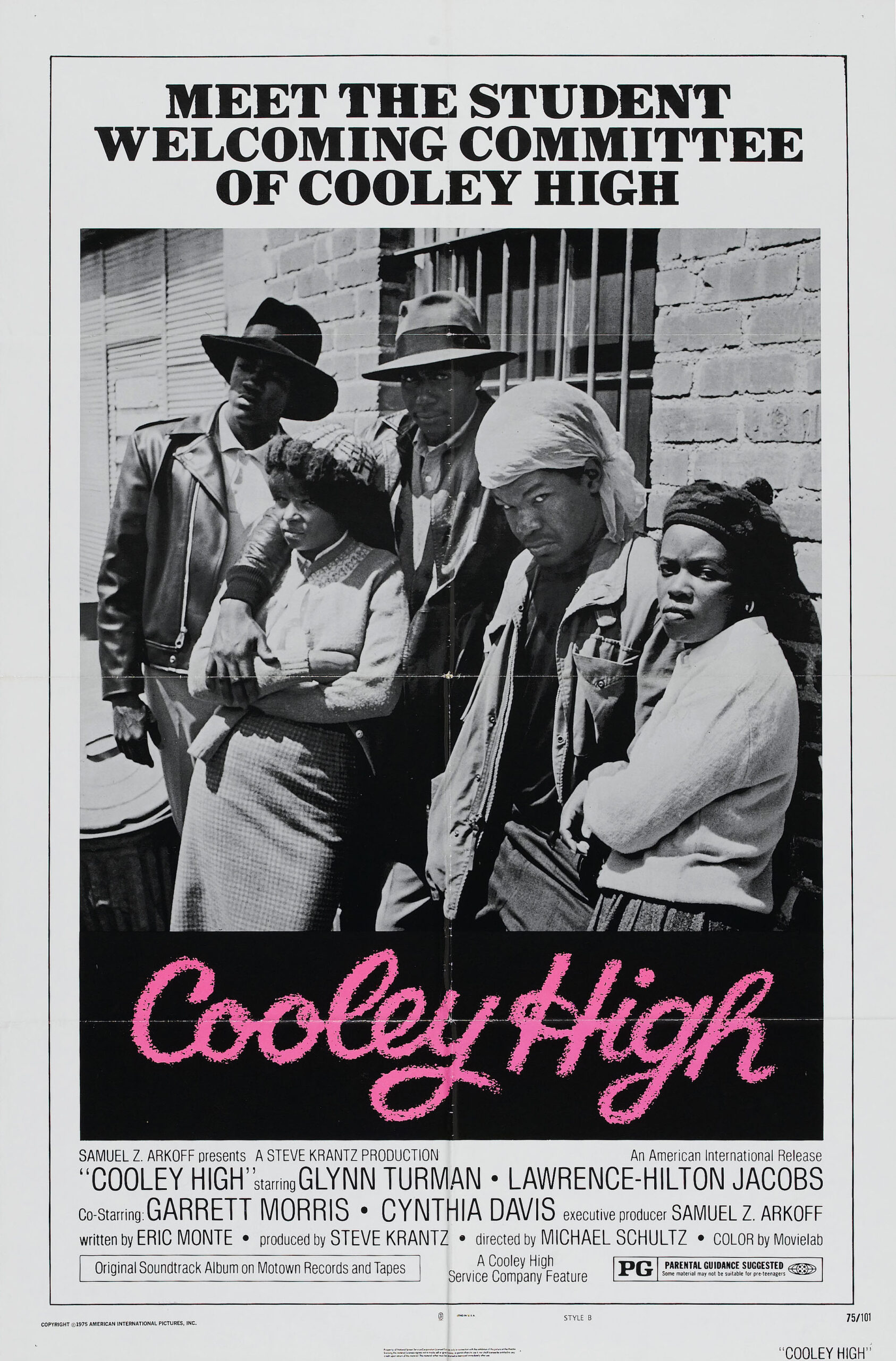 Den øverste tekst, “MEET THE STUDENT WELCOMING COMMITTEE OF COOLEY HIGH,” sætter stemningen og indikerer en relation til ungdom og skoleliv, mens den øvrige tekst præsenterer nøglepersonerne bag filmen.