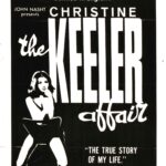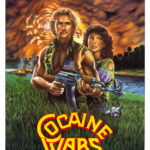 Plakaten har en dramatisk illustration med en stærk brug af farver. I forgrunden ser vi en kvinde med et skræmt udtryk, der kigger over skulderen. Hendes **blonde hår** og **hvide kjole** kontrasterer mod de mørke og intense farver, der dominerer resten af plakaten.