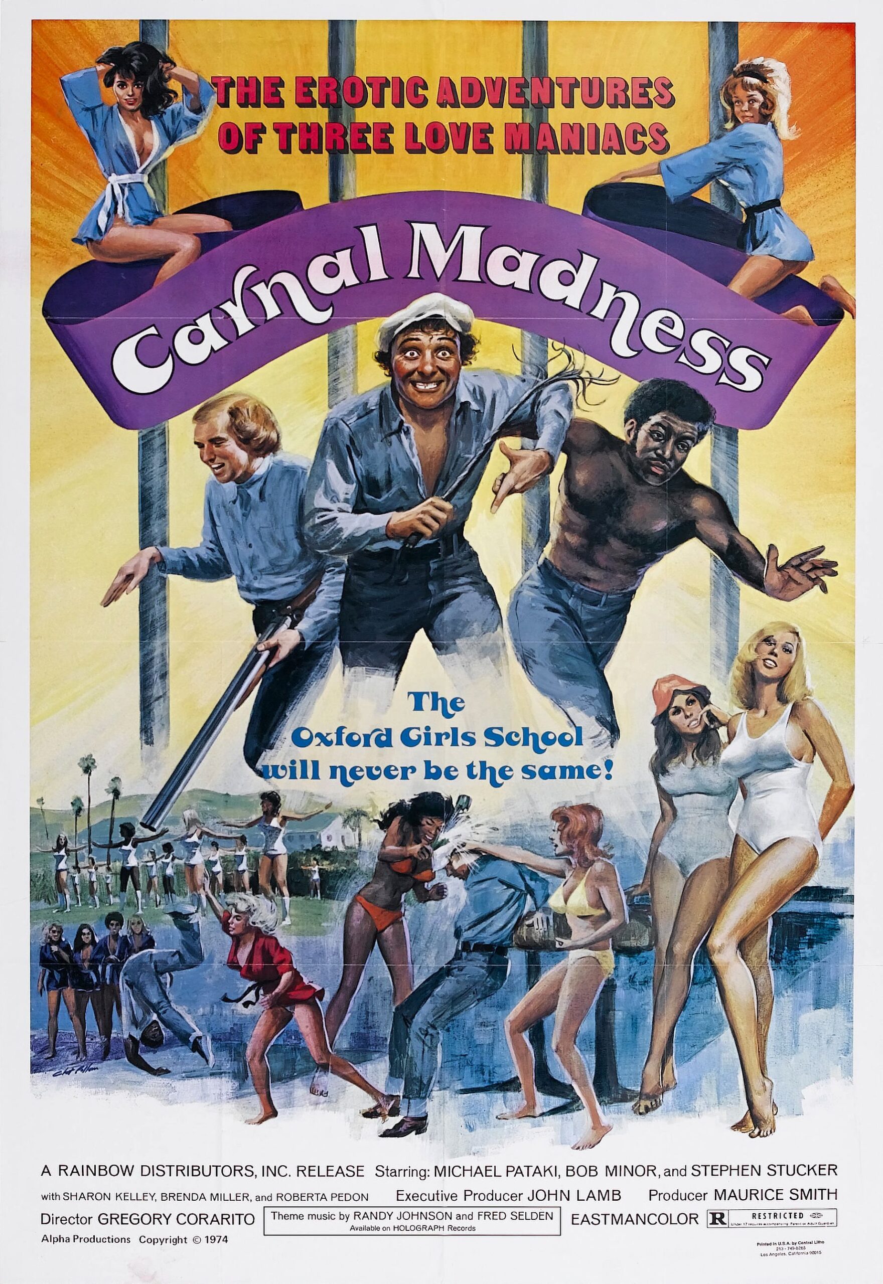 Plakaten er farverig og har en retro-stil, typisk for 1970’erne. Øverst på plakaten står der med store, fede bogstaver: “The Erotic Adventures of Three Love Maniacs”, hvilket indikerer filmens humoristiske og eventyrlige natur.