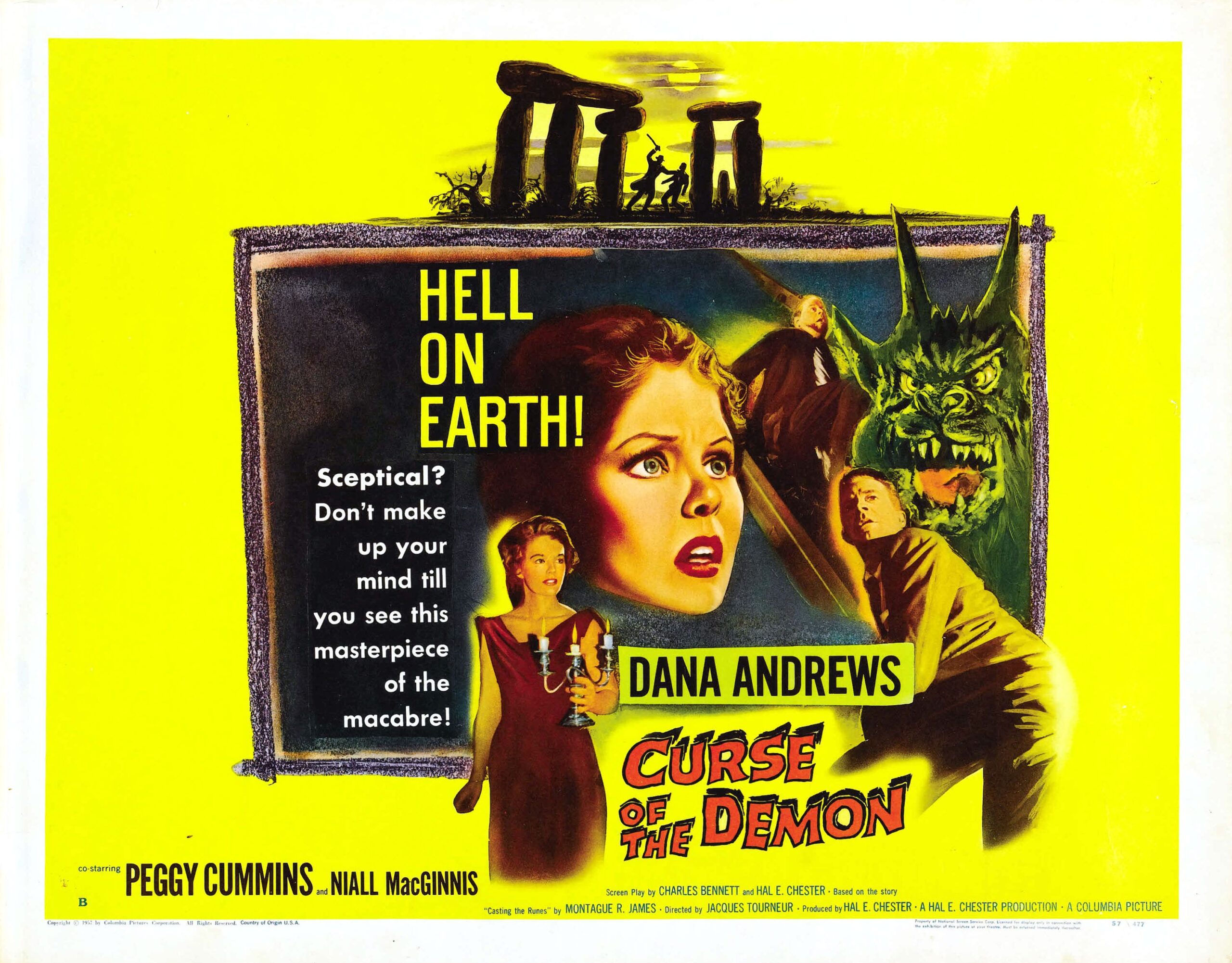 Der er en silhuet af Stonehenge øverst på plakaten, hvilket kan antyde en mystisk eller okkult forbindelse i filmen. Plakaten indeholder også teksten “Sceptical? Don’t make up your mind till you see this masterpiece of the macabre!”, hvilket yderligere understreger filmens spændingsfulde og skræmmende natur.