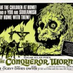 Plakaten har en skarp, rød baggrund, der straks fanger opmærksomheden. Øverst til venstre er teksten i store, hvide blokbogstaver, der beskriver en uhyggelig stemning med ordene: “THE LIVING AND DEAD CHANGE PLACES IN AN ORGY OF TERROR.” Dette skaber en følelse af uhygge og spænding.