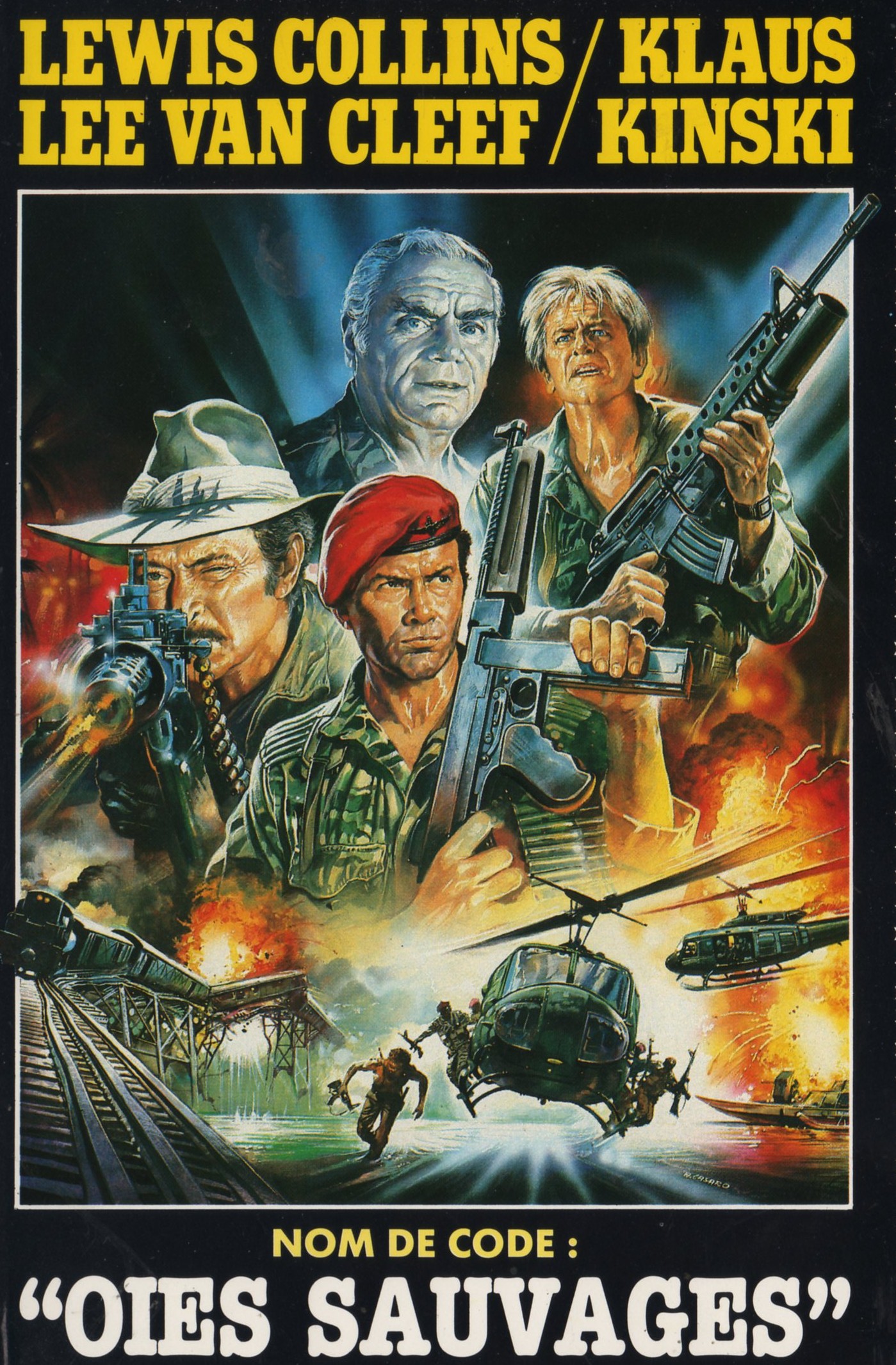 De fremtrædende navne på plakaten er Lewis Collins, Lee Van Cleef, og Klaus Kinski. Navnene er skrevet i store, gule bogstaver, der fanger opmærksomheden øjeblikkeligt.