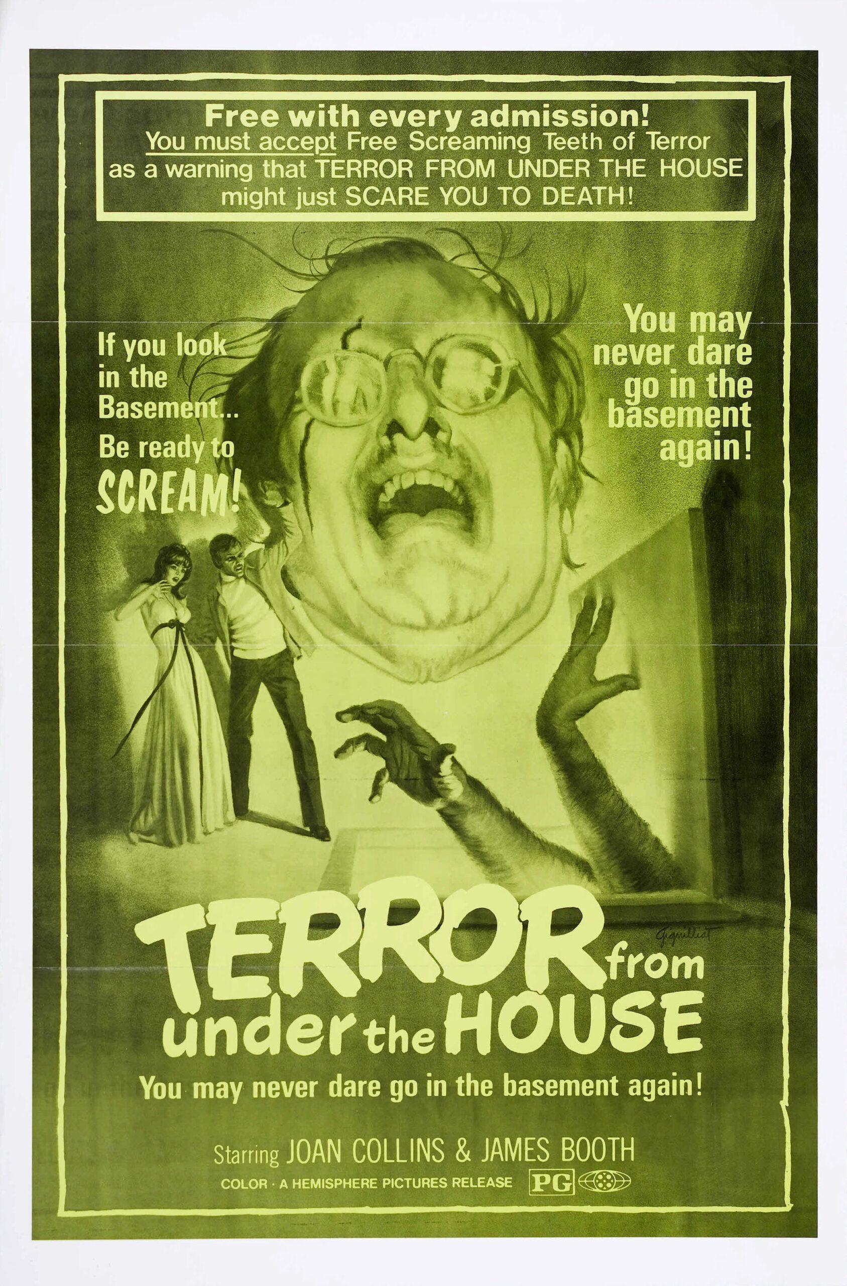 Øverst er der en markant tekst, der lover gratis “Screaming Teeth of Terror”, hvilket skal advare om filmens skræmmende indhold. Sætninger såsom “Be ready to **SCREAM**!” og “You may **never dare** go in the basement again!” understreger filmens gysergenre.