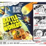 Plakaten har en dramatisk illustration af ødelagte bygninger i flammer og en gruppe mennesker, der ser chokerede op mod himlen. En stor radioantenne er rettet mod flyvende tallerkener, symboliserende den udenjordiske trussel.