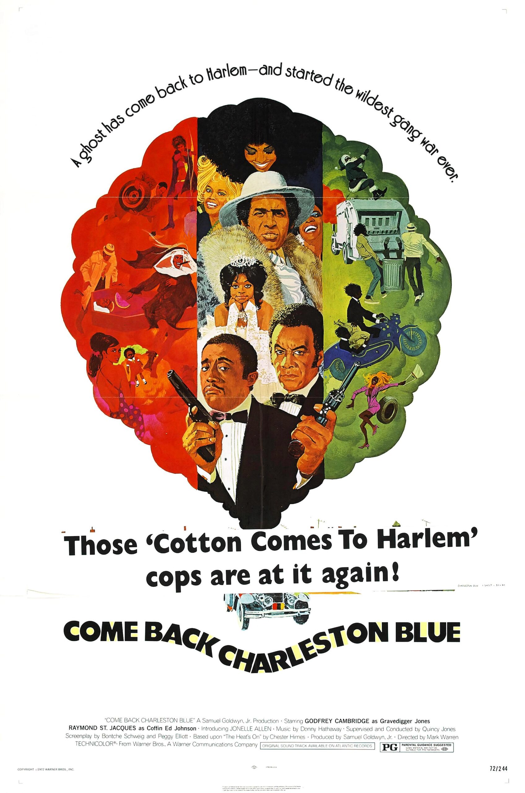 Plakaten består af en farverig collage med flere karakterer og scener fra filmen. I midten ses to mænd i jakkesæt, der holder pistoler. Omkring dem er der billeder af forskellige personer og situationer fra Harlems underverden, hvilket vækker nysgerrighed.