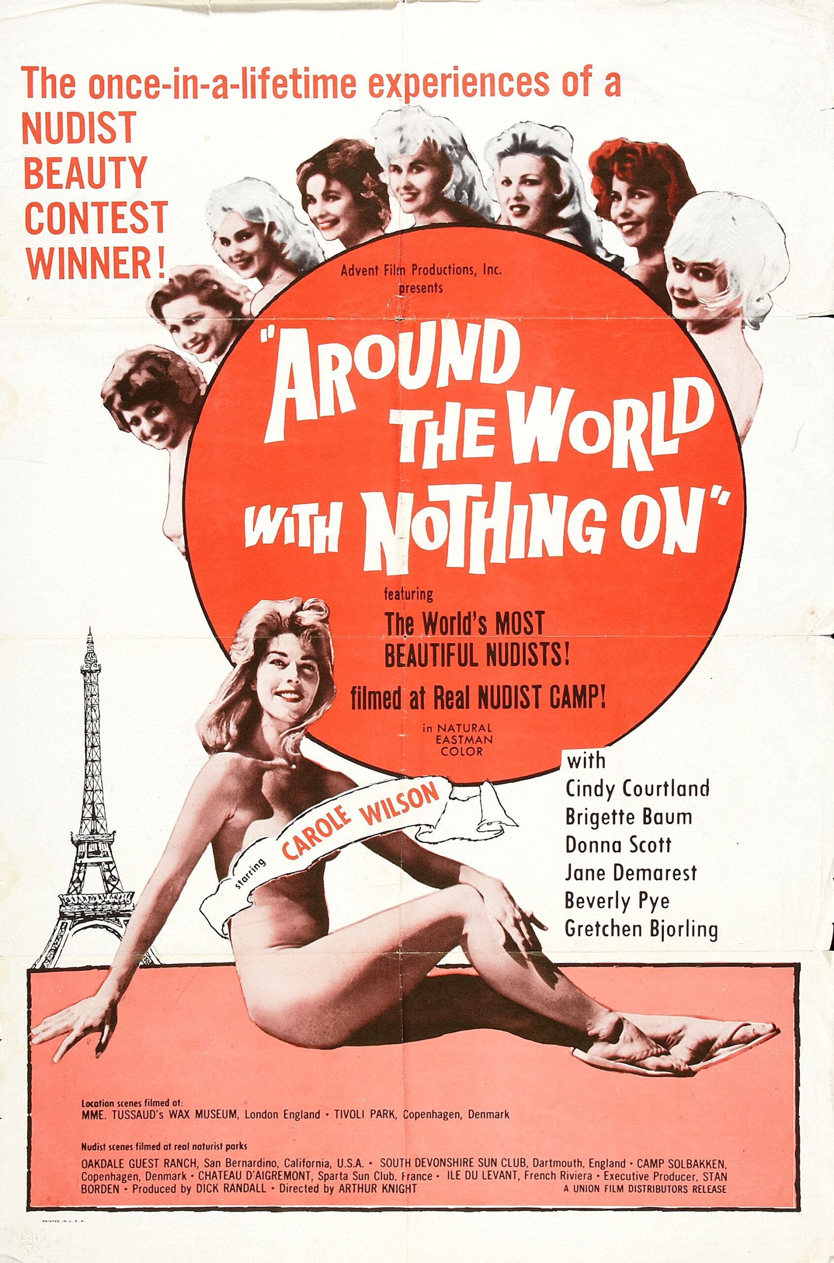 Plakaten domineres af en stor, rund orange cirkel, der indeholder filmens titel. Rundt om cirklen ser man billeder af flere kvinder, som symboliserer deltagerne i konkurrencen. Øverst står teksten: “The once-in-a-lifetime experiences of a NUDIST BEAUTY CONTEST WINNER!”