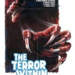 Denne farverige filmplakat fremkalder et umiddelbart indtryk af uhygge og spænding. I forgrunden ses en stor, grønlig ansigt med et skræmt og forvredet udtryk der fylder størstedelen af plakaten. Den intense og ekspressive illustration fremhæver øjnene og munden, hvilket skaber en følelse af angst. Til venstre for ansigtet er indsat en mindre illustration af en mand, som synes at kigge bekymret tilbage over sin skulder. Bag ansigtet er en silhuet af en mystisk figur der bærer et våben, hvilket antyder fare og kan hinte om morderen eller monstret i filmen.