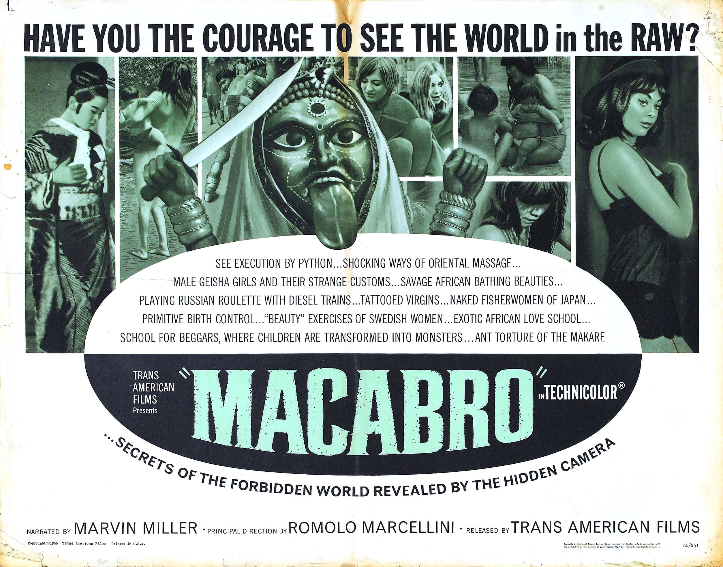 Filmplakaten præsenterer en række forskelligartede og provokerende billeder arrangeret i et collage-format. Farveskemaet er domineret af grønne og sorte nuancer, hvilket giver plakaten en dyster og mystisk stemning. I toppen af plakaten står en fremtrædende og udfordrende tekst: “HAVE YOU THE COURAGE TO SEE THE WORLD IN THE RAW?” Dette kan antyde en dokumentarisk eller sensationel stil til filmen.