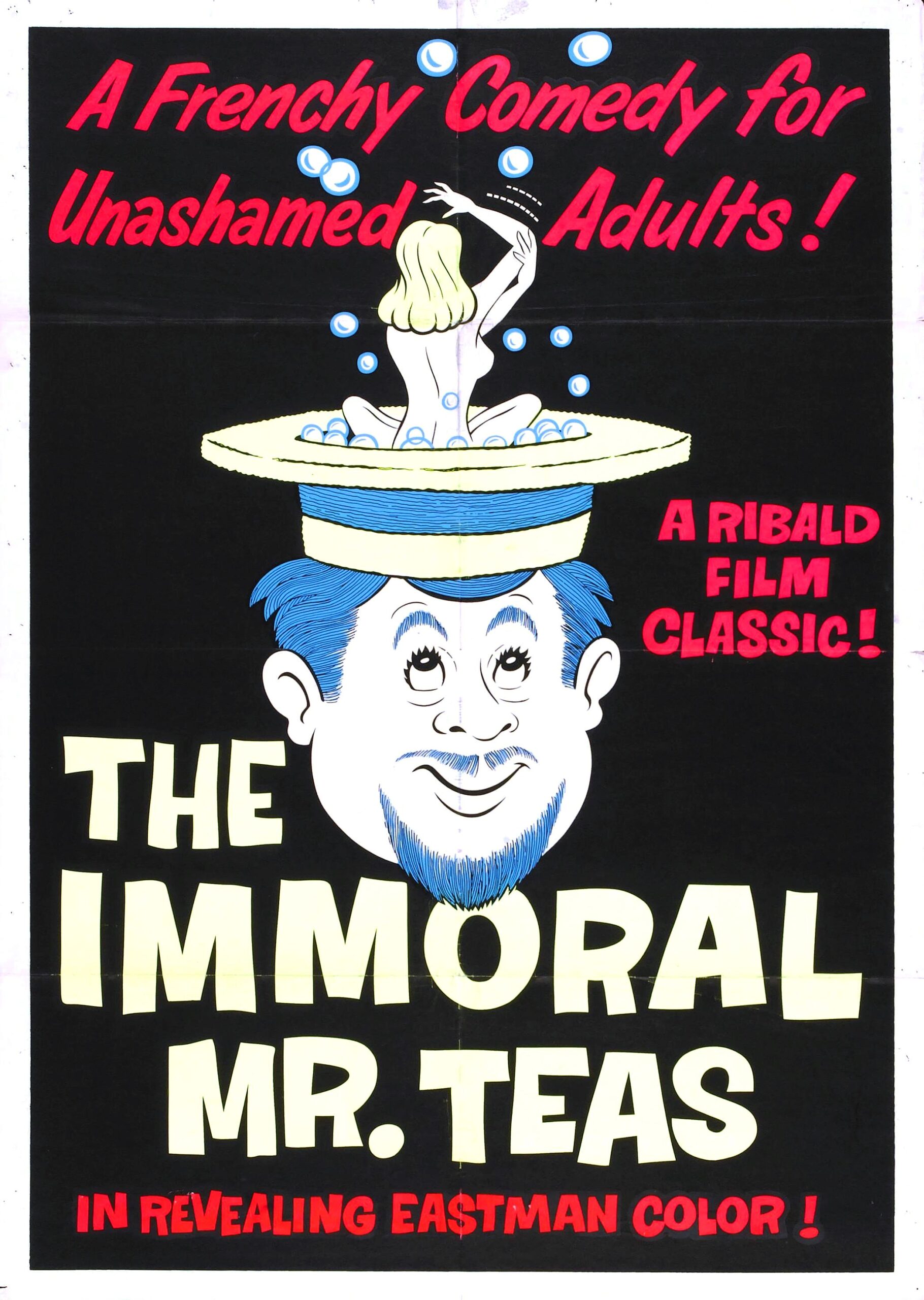 Plakatens design er iøjnefaldende med en stor illustration af et mandligt ansigt og en kvinde, der sidder i en kæmpe tekop. Kvinden synes at tage et bad, som matcher filmens frækhed og komiske stil. Baggrunden er overvejende sort, hvilket får de store, gule og røde bogstaver til at stå tydeligt frem. Disse elementer antyder en humoristisk og måske satirisk tone i filmen.